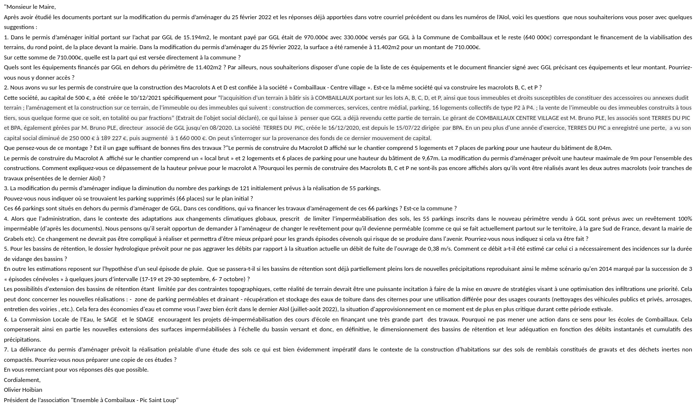 Après avoir consulté l’ensemble des documents, nous avons sollicité la mairie pour obtenir plus d’explications sur certains points et afin de donner des suggestions qui nous semblent aller dans le sens du bien publique. Voici donc notre mail et la réponse qui a suivie.
